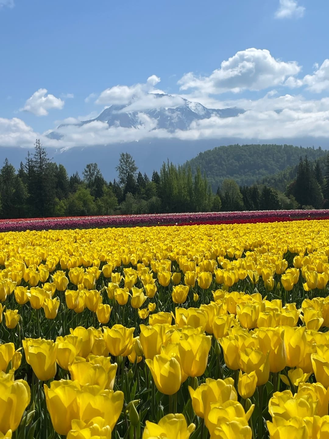 튤립을 배경으로 뒤에 설산이 펼쳐진 거예요🏔️